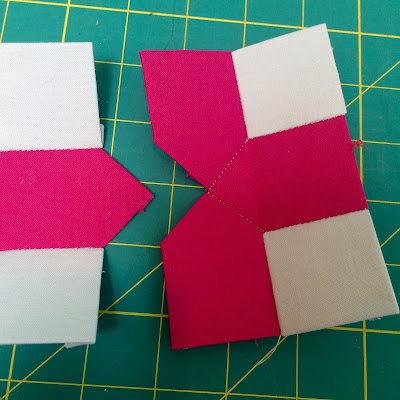 While I was working on these pluses, I found myself thinking "hmmmm I wonder if I could turn these into the raspberry kisses blocks that I love so much?" Here's Rachel (Wooden Spoon Quilts) original tutorial for the kiss blocks made by machine. I love this tutorial and have made several things using it! But could I EPP the same blocks? I wondered. (and I know a few of you are rolling your eyes at me right now! I SEE YOU THROUGH MY COMPUTER! humor me people!)
