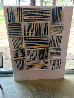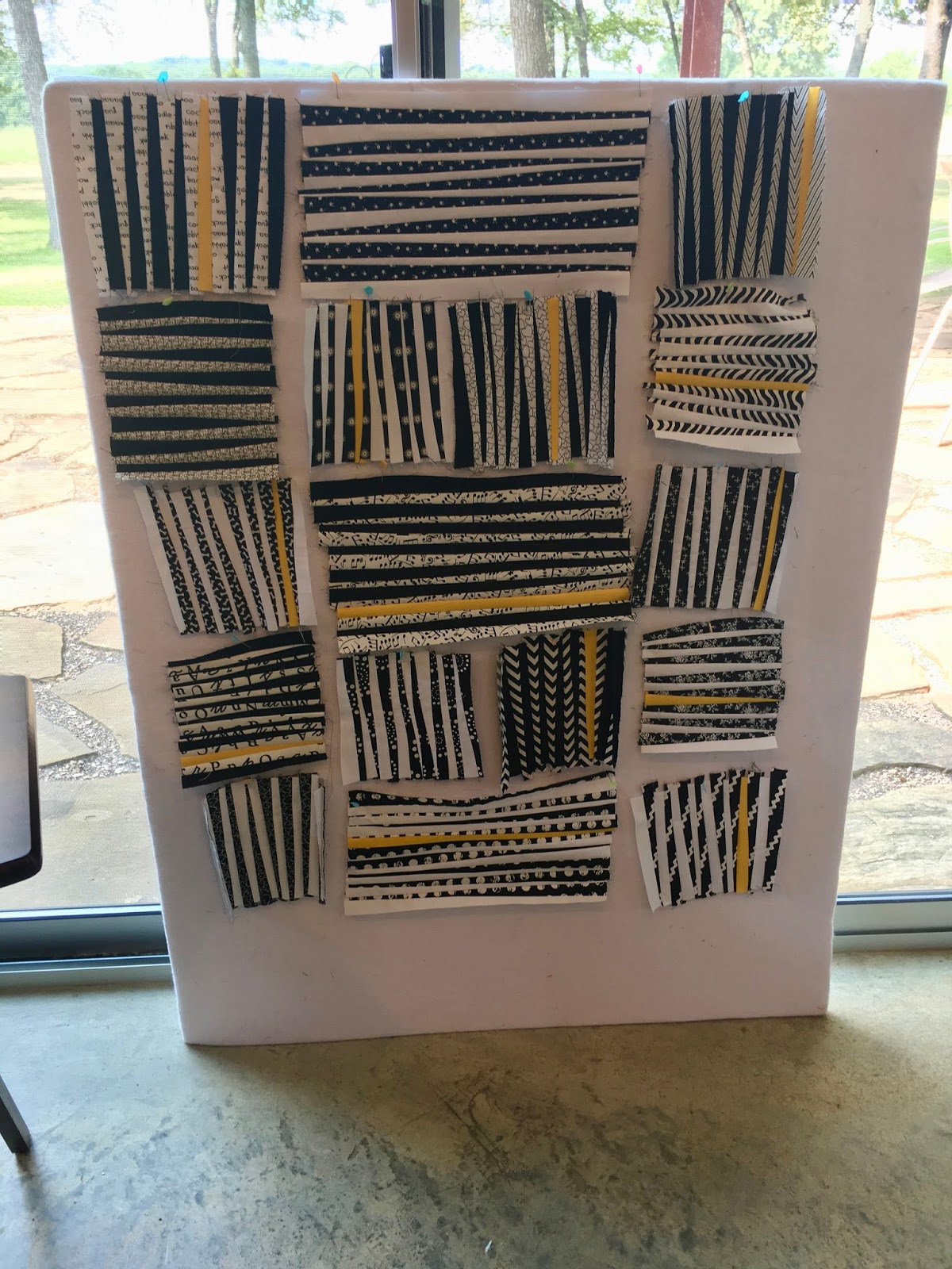 A few weeks ago, Debbie, over at A Quilter's Table, started an improv stripes sew along. On the first day she gave us a tutorial for how she makes her blocks. This happened to coordinate with my retreat so, after finding some internet when we went into town, I read her post and set to work! I used all black and white prints, along with black, white & a bit of yellow solids.