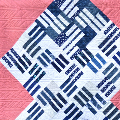 I played with them on my design wall at home for quite a while before I came up with the final layout. Putting them on point and adding coral "kisses" triangles was just the ticket!