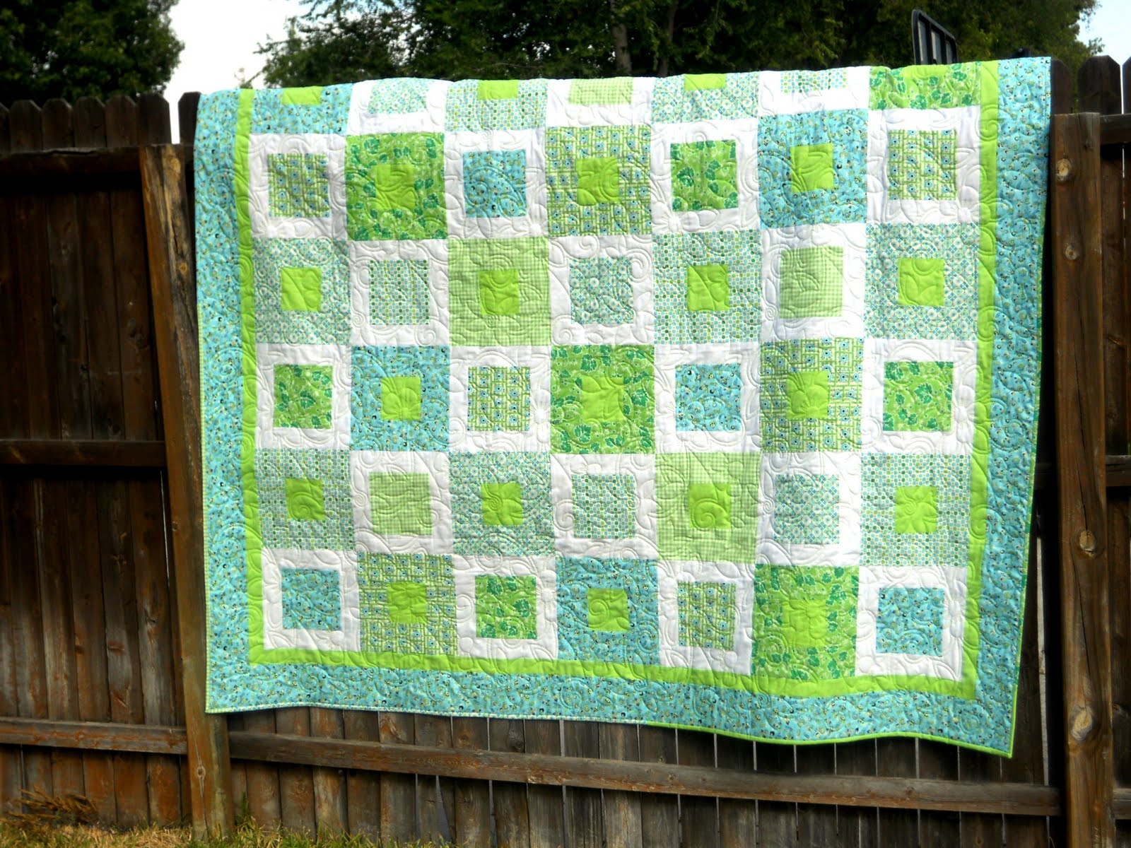 It's a snuggle quilt for the couch. I made it because I was poked fun at for having our Christmas quilt out in June. I like the Christmas quilt (Mom made it for us) because it's big & snuggly. So I decided to make a big & snuggly quilt to take it's place when it's not Christmastime!